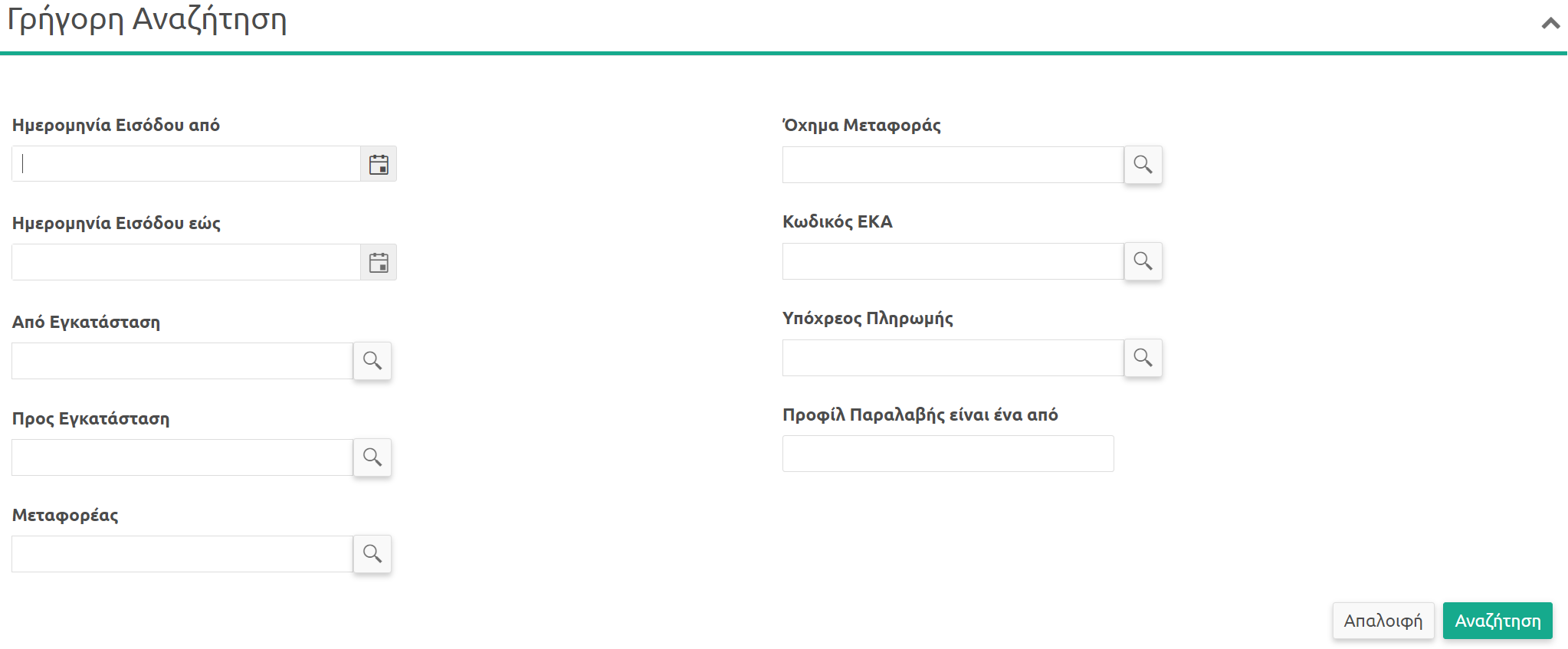 Η γρήγορη αναζήτηση αποτελεί ουσιαστικά ένα εργαλείο για φιλτράρισμα των εγγραφών της εφαρμογής. Ο χρήστης, έχει τη δυνατότητα να ορίσει τιμές στα φίλτρα που τον ενδιαφέρουν και αφού επιλέξει “Αναζήτηση”, να προβληθούν οι επιθυμητές εγγραφές στη λίστα.